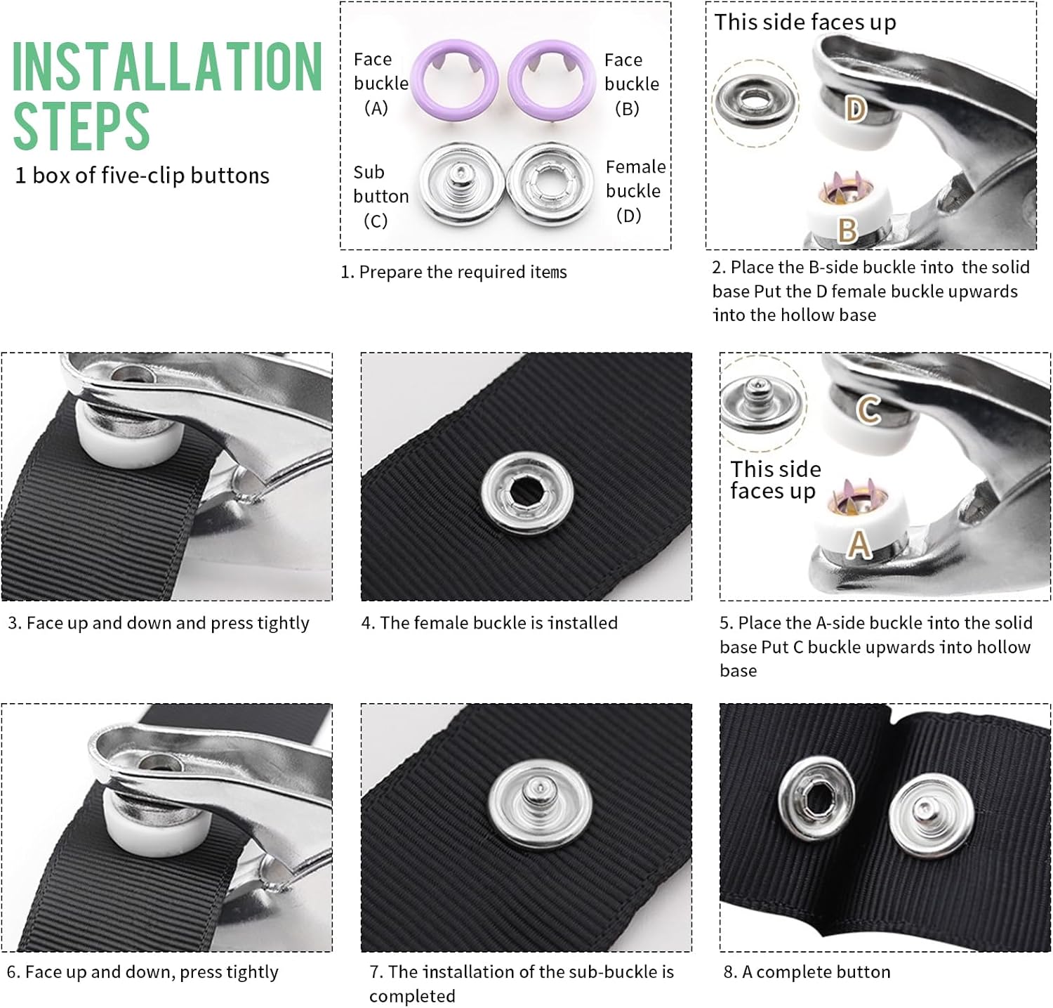 100 pcs snap button fastener kit, 9.5mm metal press stud tool snap fasteners with pressure pliers 10 colour poppers fasteners no sewing for handmad crafting1.snap button fastener kit is suitable for a variety of items, including t-shirts, jeans, jackets, bags and crafts. it is also suitable for repairing or replacing broken fasteners, and is a great option for both beginners and professionals.2.the metal press stud tool is great for using hollow and solid metal prong snaps. it'll help you get buttons on in no time and make your work more efficient. Specification: Product size: 15.5*15.5*2.3g Product weight: 210g Packing size:15.5*15.5*2.3g Package weight: 210g Color: Colourful Material: Metal package Inside: 100 PCS Snap Button Fastener Kit