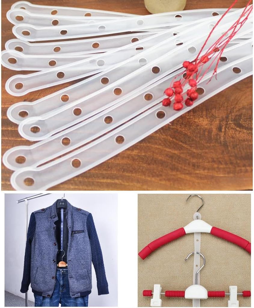 Transform your wardrobe organisation with these practical clothes hanger connector strips. Each pack includes 10 white plastic strips measuring 48 centimetres in length, featuring 14 strategically placed holes for versatile hanging options. These connector strips are designed to maximise your closet space by allowing vertical arrangement of multiple hangers, effectively doubling or tripling your storage capacity. The simple yet functional design makes them perfect for both home wardrobes and retail displays. Each strip can securely link multiple hangers together, creating a cascading arrangement that keeps your garments organised and easily accessible. The durable plastic construction ensures reliable performance, while the straightforward installation requires no special tools or expertise. Ideal for managing seasonal wardrobes, suits, coordinated outfits, or retail merchandise displays. These connector strips work with standard clothes hangers and help maintain a tidy, space-efficient closet system.
