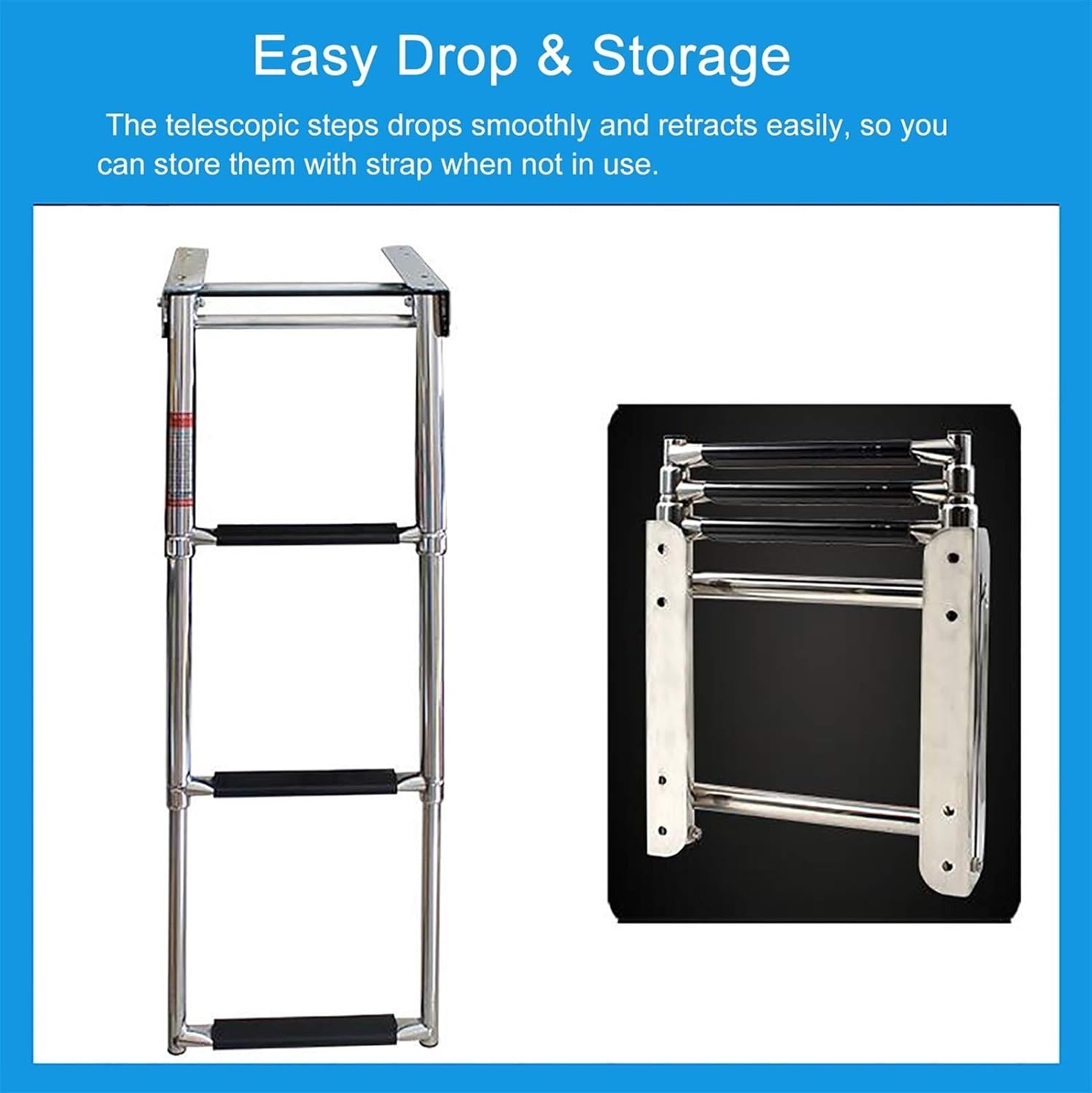 Product DescriptionSleekly designed and manufactured from a high-grade stainless steel, this marine product has been designed to last in the harsh marine conditions. This telescopic boat ladder is made to be bolted to a horizontal platform such a the boat floor or side railings depending on the installation.SpecificationMaterial: Premium 316 stainless steel Finish: PolishedLadder Length (extended): 3 step: 90cm(35.4in) 4 step: 115cm(45.3in)Length Stowed: 3 step: 38cm(15in) 4 step: 46cm(18in)Overall Ladder Width : 30cm(11.8in)Max Load: 150kg/330lbsFeaturesHeavy duty all welded 316 stainless steel pontoon ladder.Wide steps that telescope for a nice clean look.Easily mounts to deck Flips up .The folding steps drop smoothly and quickly into the water to provide convenient boarding.Package Includes1 × Boat Ladder (Installation accessories)NoticePlease allow 1-2cm difference due to manual measurement.The color of the actual items may slightly different from the listing images due to different computer screen.If you like our products and services check out our store for different sizes and models ladders.