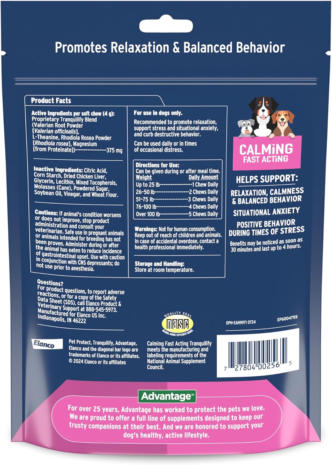 K9 Advantix II Medium Dog is the veterinarian-recommended formula that helps defend your dog against five pests: fleas, ticks, mosquitoes, biting flies and lice. And unlike other treatments, K9 Advantix II kills and repels fleas, ticks and mosquitoes. K9 Advantix II topical treatment gets straight to work killing fleas on dogs within 12 hours of initial application. This formula stops existing flea infestations and prevents new ones by killing adult fleas on contact so they can’t lay eggs and they don’t have to bite your dog to die. Fleas, ticks, mosquitoes and other pests not only cause discomfort; they may also transmit disease. Help support relaxation and calmness in your dog when they need it most with Pet Protect Fast-Acting Calming Soft Chews for Dogs. These calming soft chews can help support positive behavior during times of stress and situational anxiety, such as fireworks and thunderstorms. Pet Protect calming soft chews for dogs are powered by Tranquilify, a vet-formulated blend of Rhodiola Rosea powder, Valerian Root powder, Magnesium, and L-Theanine that supports positive behavior during times of stress.