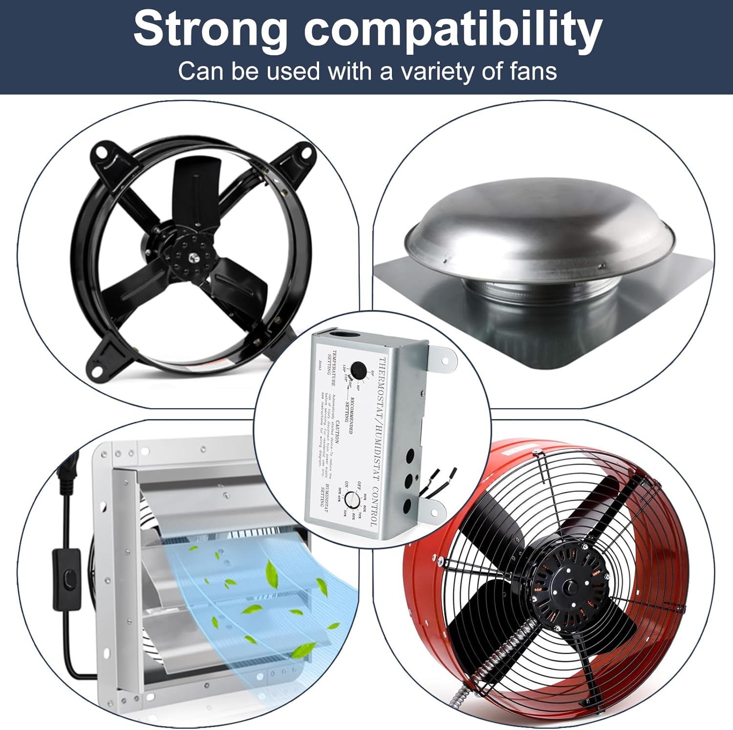 Technical Specification◆Voltage Capacity: 120 V◆Current Capacity: 10 Amps◆Temperature Control Range: 60°F-120°F◆Humidistat Control Range: 30%-90%◆Main materials: Alloy.Recommended CombinationCompatible with ventilation fan and motor models➤Power Vent Attic Fan Motor✔Lomanco F0510B2944✔Lomanco F0510B2705✔9800527✔99080267✔DOW-136-0-34✔DOW-136-0-40-XIN✔F0510B2944✔F0510B2497✔A0416B2059, A0510B2389, A0416B2059, AO416B2059, AO41682059. ✔ A0510B2389, AO510B2389, AO51082389.➤ Attic fan✔ Lomancool 1800 series: Lomanco 1800, Lomanco 1800CK, Lomanco 1800TH, Lomanco 1800THCK. ✔ Lomancool 2000 series: Lomanco 2000, Lomanco 2000CK, Lomanco 2000TH, Lomanco 2000THCK.✔53828, 53826, 53827, 53829, 53830, 53833, 53831, 53832, 53853, 53854, 53315, 53316 & 53319 Air Vent Attic Fan.