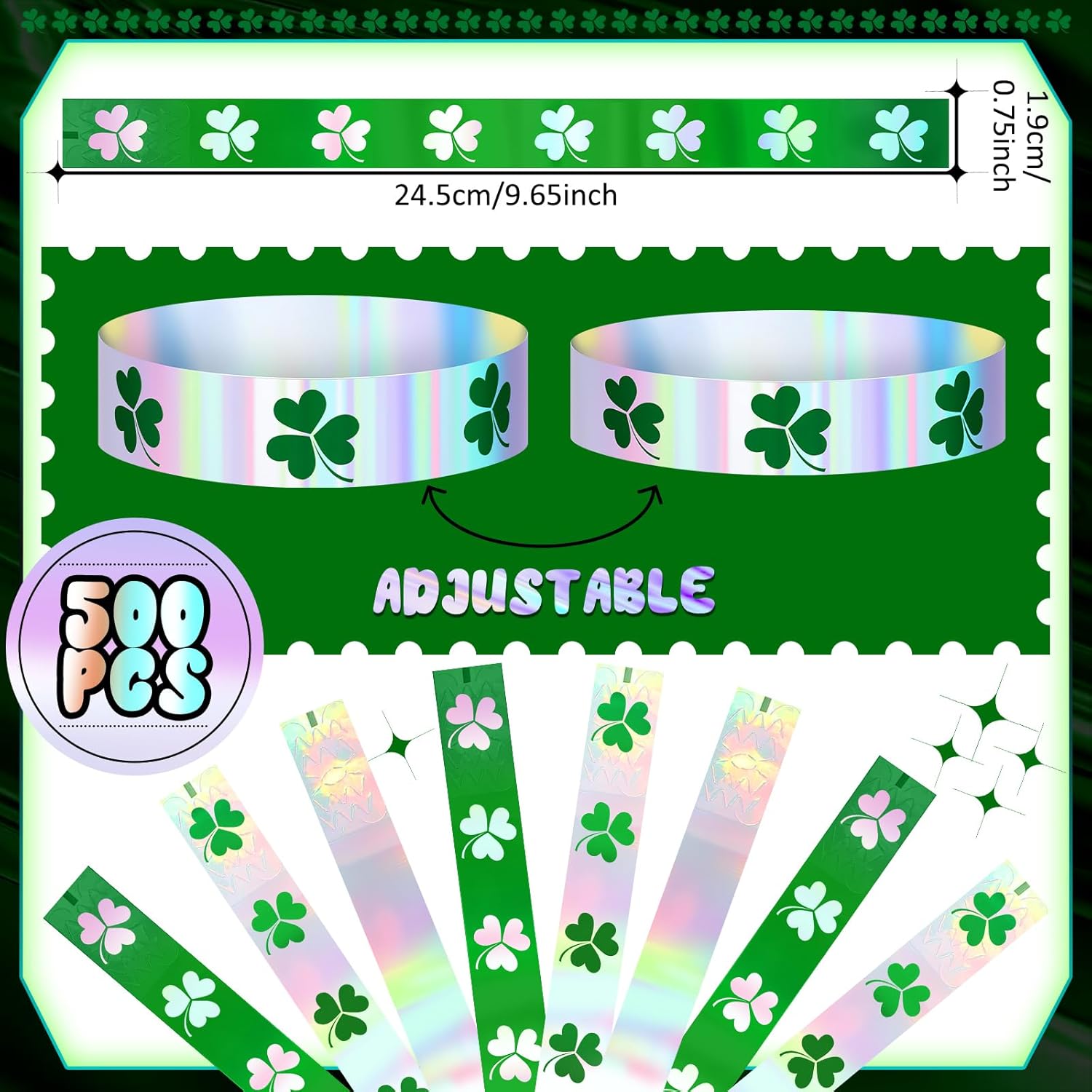 Features: Vibrant Green: The wristband features a vibrant green color that echoes the traditional color of St. Patrick's Day. This vibrant color adds a fun touch to your celebrations and enhances your St. Patrick's Day experience. Shamrock Wristband: Each St. Patrick's Day wristband is designed and crafted with intricate detailing of the shamrock symbol, making these wristbands a complement to your St. Patrick's Day celebrations. Specifications: Material: holographic Color: green Size: 9.84 inches/ 24.99 cm Package includes: 500 X Shamrock Wristbands Notes: Manual measurement, please allow slight errors on size. The color may exist a slight difference due to different screen displays.