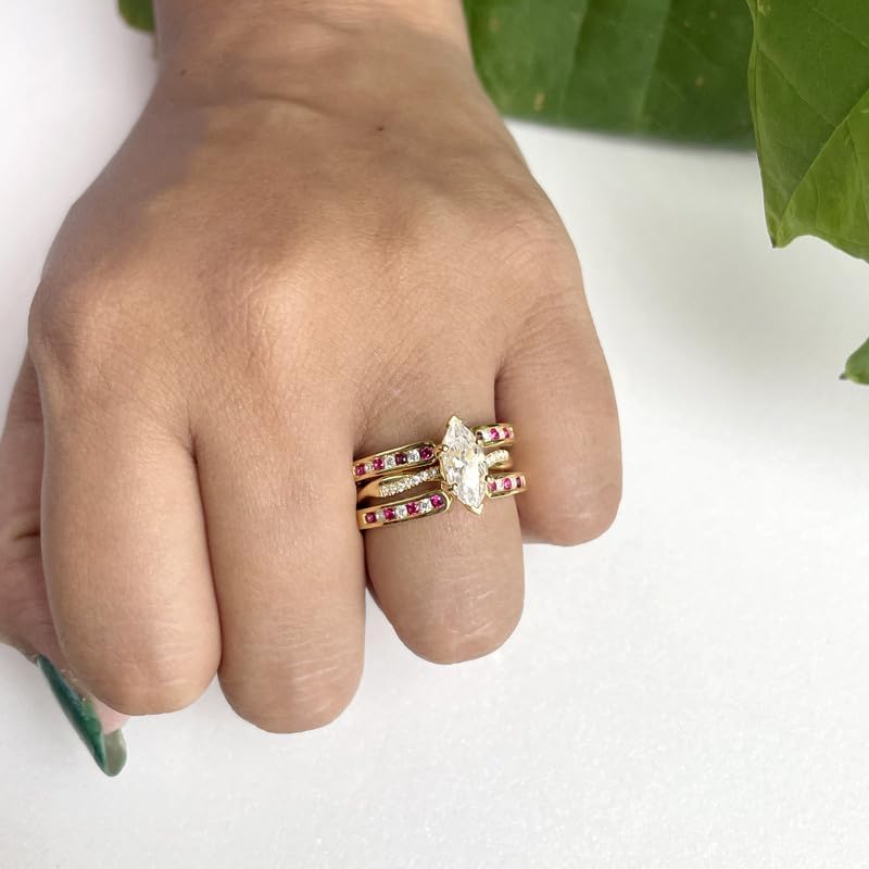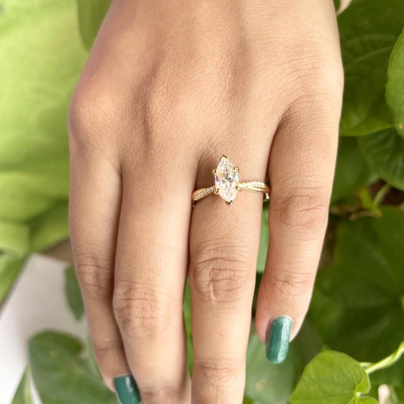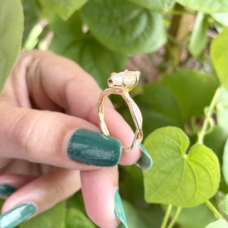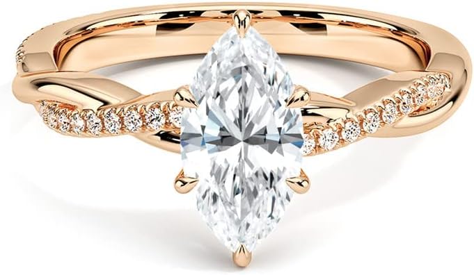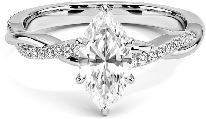 This Engagemnet Ring Featured Swirl Twisted Style Crafted in 925 Sterling Silver, available in 14K White, Yellow and Rose Gold Plating. Marquise Cut GRA Certified Moissanite set in Prong setting.