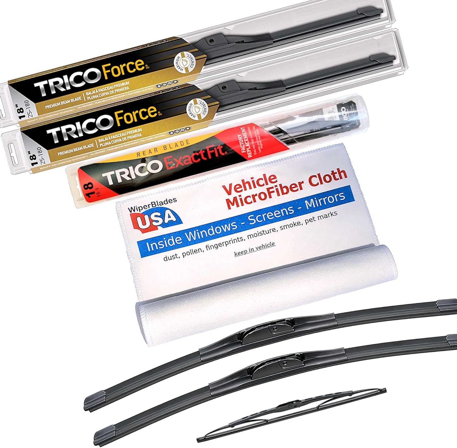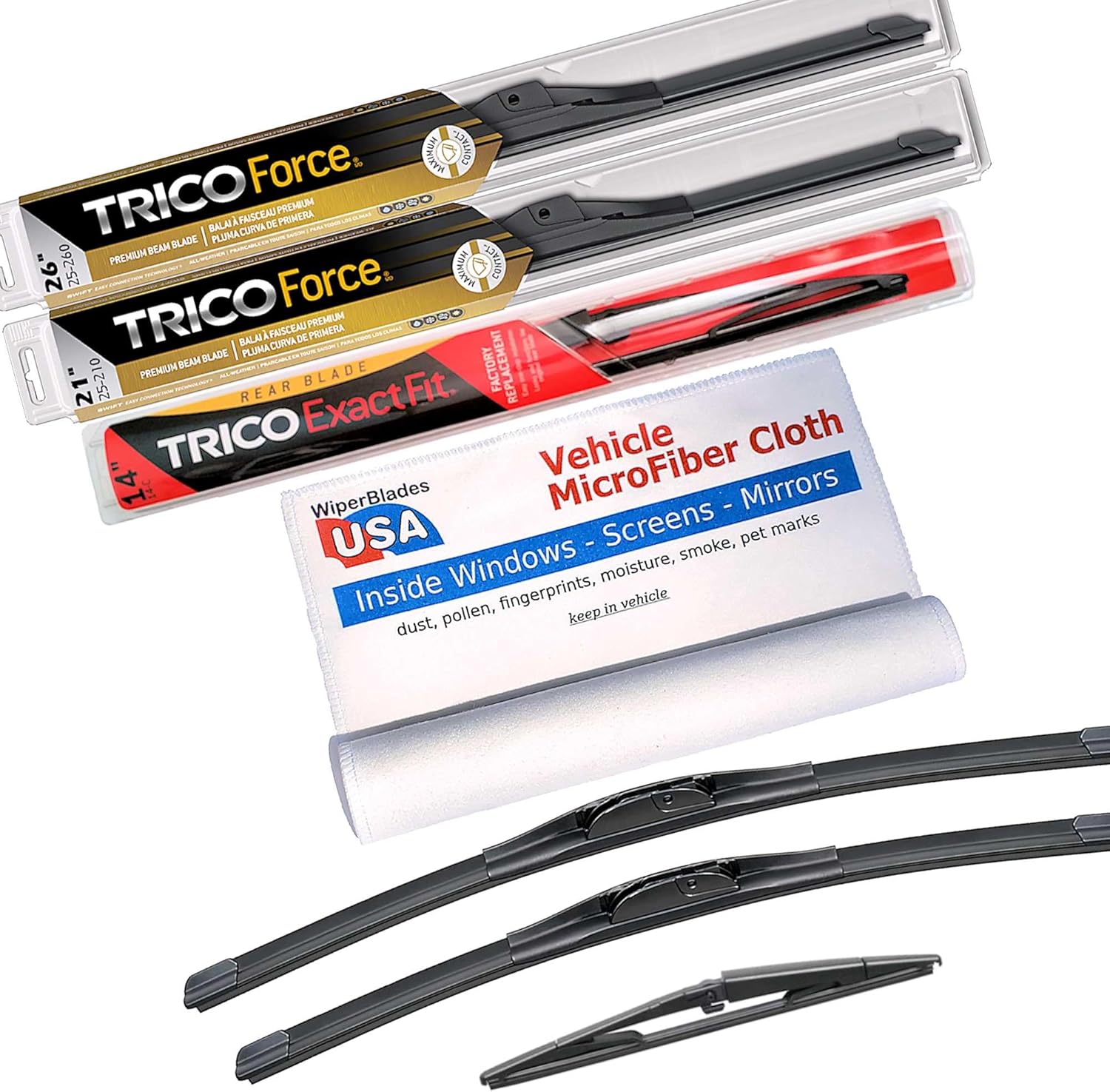 Premium Beam Wiper Blades set +Trico ExactFit Rear wiper. Compatible with Chrysler Town and Country 2014Trico Force Premium Beam Wiper Blades - "Turning wind force into wiper pressure" These Trico Force Premium Beam Wiper Blades are a great choice and are compatible with your Chrysler Town and Country 2014 because: When you need "extra" pressure on your wiper blades to keep them stable on your large curved windshield then Trico Force is the premium beam blade for you. Trico Force Wipers are robustly engineered beam blades with a patented swept-wing spoiler that slices through turbulence caused by cross winds, buffeting truck winds and general traffic disturbances. Designed with an innovative aerodesign, these high performance wiper blades control airflow and transfer it into maximum wiper/glass contact for a flawless wipe, providing excellent visibility in all driving situations. VorTec aerofoil converts wind force for maximum windshield contactHighGlide treated rubber element for a smoother, quieter wipeRobust super-structure for durable all-weather performance Memory Curve Steel® beamSWIFT® Easy Connection TechnologyTested to perform over 1.5 million cyclesAnd Trico is the #1 wiper manufacturer in the United States. So you know you can depend on them.