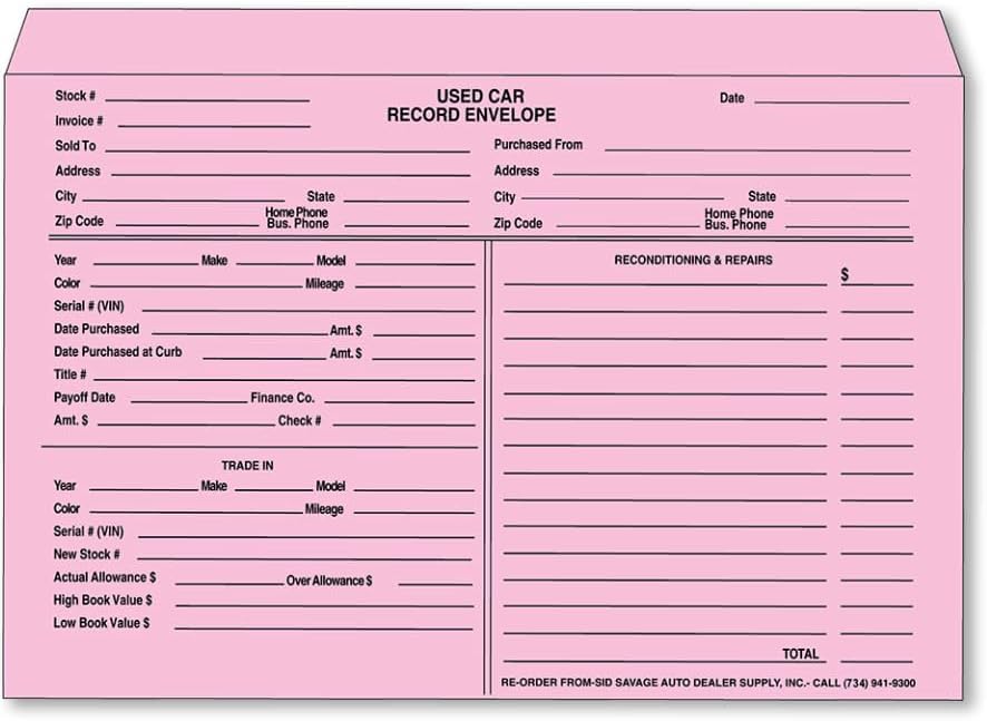 Used Car Record Envelopes provide space for vehicle information, purchaser information, trade-in information, and reconditioning & repair. Record jackets keep all information together for easy retrieval when selling or maintaining the car. Envelopes are sold 100 per pack and measure 9"H x 12"W. Envelopes are made with 28# paper