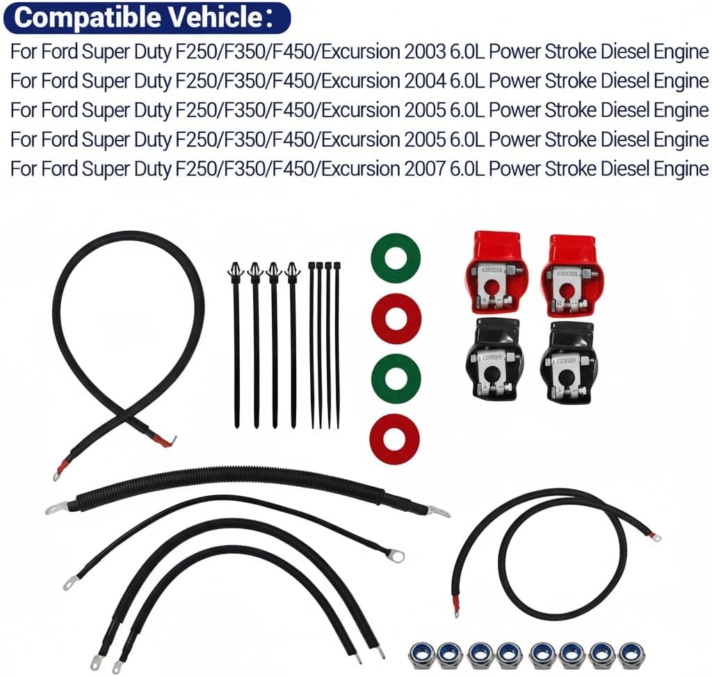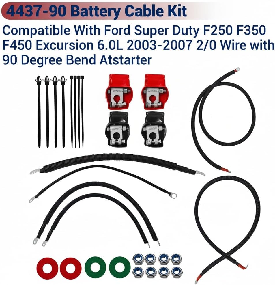 Upgrade your truck's starting system with our precision-engineered battery cable replacement kit. Designed specifically for 2003-2007 Ford F250, F350, and F450 Super Duty trucks equipped with the 6.0L Powerstroke diesel engine, this kit offers a superior solution to restore lost cranking power and electrical reliability. A common issue in older trucks is voltage drop through worn or corroded factory cables, leading to slow starts and electrical gremlins. Our kit directly addresses this by providing high-quality, large-diameter 2/0 AWG gauge cables, ensuring maximum current flow for a strong, dependable start every time. The standout feature is the integrated 90-degree bend at the starter connection. This thoughtful engineering makes installation in the tight engine bay significantly easier and cleaner, providing a perfect fit that avoids interference with other components. Constructed with high-purity copper strands for optimal conductivity and covered in a durable, heat- and oil-resistant insulation, these cables are built to withstand the harsh under-hood environment. This is not just a replacement—it's an upgrade to your truck's electrical foundation, promoting better starter performance and overall electrical system health.