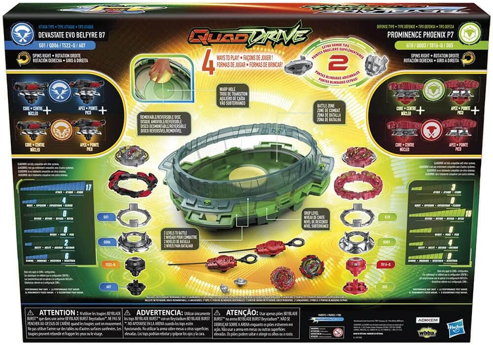 Beyblade QuadDrive tech puts the future of Beyblade battling in your hands with first ever customizable 4-in-1 top! QuadDrive tops configure in 4 ways, for 4 ways to strategize, 4 ways to customize, 4 modes to battle, and 4 modes to win! Modify top to gain advantage! Customize battle on 2 levels with the Interstellar Drop Battle Set! Comes with Beystadium, right/left-spin Beyblade launcher (2), and extra Armor Tips (2). Also includes 2 right-spin QuadDrive battle tops: Devastate Evo Belfyre B7 G01 QD06 TS22-Q A07 and Prominence Phoenix P7 G10 QD03 TB16-Q D05. Battle on top level of Beyblade stadium, then remove disc, drop through Warp Hole, and take battle to the drop level. Swap Armor Tips to change top type. Scan code on QuadDrive tops to battle in Beyblade Burst app! If you’re looking for dynamic girls and boys toys, licensed Takara Tomy Beyblade Burst games allow kids to enter the Beyblade arena and launch into head-to-head battles! Beyblade Takara Tomy-licensed toys make great gifts for boys and girls 8 years old and up. (Each sold separately, subject to availability.) Hasbro and all related terms are trademarks of Hasbro, Inc.